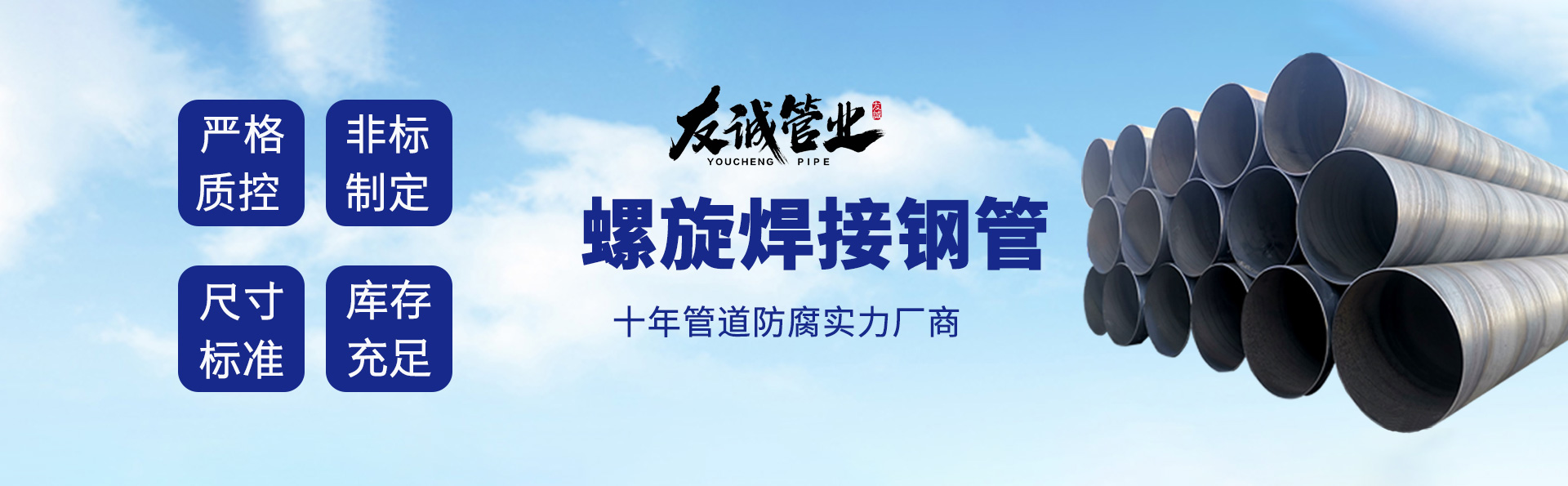 滄州友誠(chéng)管業(yè)有限公司是一家專(zhuān)業(yè)從事生產(chǎn)防腐涂塑管道及管件于一體的大型企業(yè)。公司注冊(cè)資金8600萬(wàn)元,位于中國(guó)管道生產(chǎn)基地—河北鹽山縣,近靠京滬高速、榮烏高速、黃石高速30公里,高鐵滄州西站40公里,天津國(guó)際機(jī)場(chǎng)、濟(jì)南遙墻機(jī)場(chǎng)150公里,為客戶(hù)來(lái)訪及業(yè)務(wù)發(fā)展提供了便利的交通條件。        鋼管系列:螺旋鋼管、無(wú)縫鋼管、ERW直縫焊管、JCOE埋弧焊直縫鋼管、熱鍍鋅鋼管。        涂塑系列:內(nèi)外涂塑鋼管、涂塑復(fù)合鋼…… 了解更多